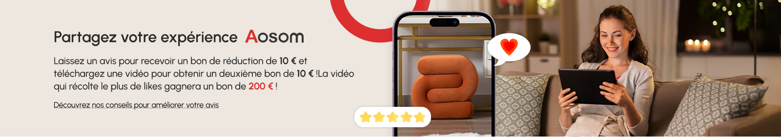 Les avis produits aident les autres clients à choisir les articles qui leur conviennent. Nous vous encourageons à partager un retour complet et sincère. Voici quelques conseils pour rendre votre avis le plus utile possible : Soyez honnête Partagez votre véritable expérience avec le produit que vous avez acheté. Décrivez ce que vous avez aimé et ce qui pourrait être amélioré. Un avis authentique, avec ses points forts et faibles, aide réellement les futurs acheteurs. Ajoutez des photos et/ou vidéos Vos images et vidéos renforcent la crédibilité et l’authenticité de votre avis. Elles montrent que vous avez vraiment testé le produit et permettent aux autres de mieux comprendre ses caractéristiques et son usage. Idées de photos à inclure - Vue d’ensemble du produit : photo claire sur fond neutre. - Détails : gros plan sur la matière, les finitions, le logo ou les étiquettes. - Produit en situation : photo montrant comment vous l’utilisez réellement. - Référence de taille : à côté d’un objet du quotidien pour se rendre compte des dimensions. - Avant / après installation : idéal pour montrer le montage ou la transformation. Idées de vidéos à partager - Unboxing : filmez votre réaction à l’ouverture du colis et montrez le contenu. - Installation / montage : montrez la simplicité ou les étapes clés, très utile pour les autres acheteurs. - Produit en action : démontrez son utilisation dans la vie réelle – les vidéos les plus utiles ! - Mise en scène / déco : montrez comment il s’intègre dans votre intérieur et partagez vos idées déco. - Comparatif : si vous avez un modèle précédent ou d’une autre marque, expliquez en vidéo pourquoi vous préférez celui-ci.