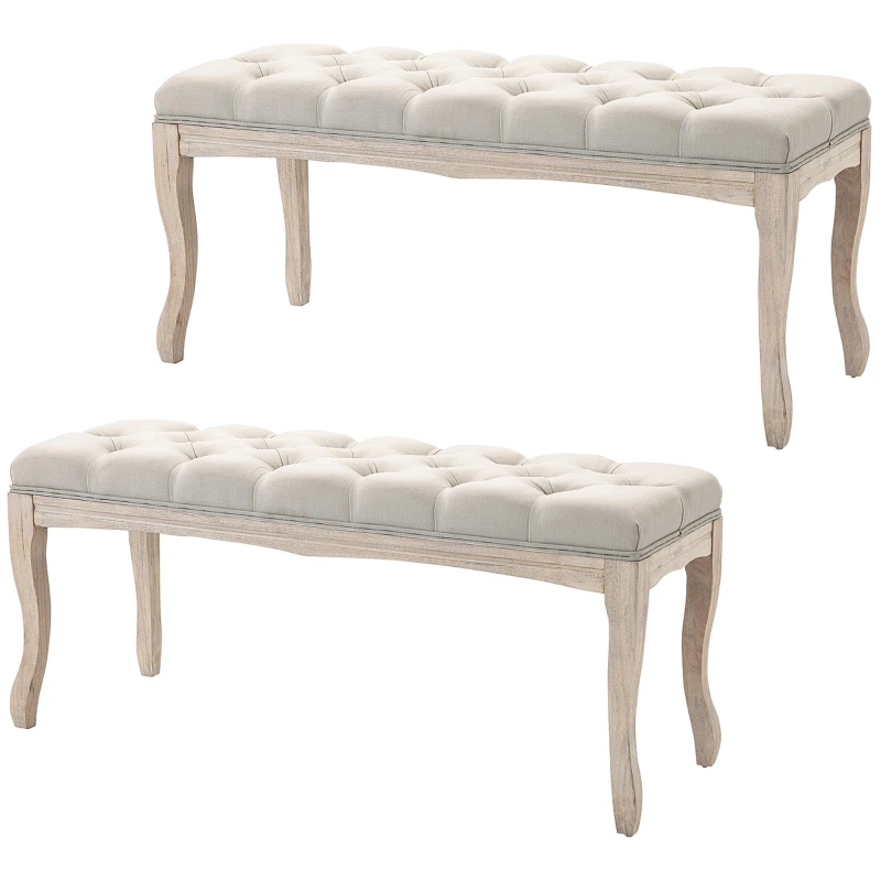 HOMCOM Lot de 2 banc Banquette capitonnée Style Classique 110 cm Bout de lit Rembourrée en lin piètement Bois hévéa sculpté
