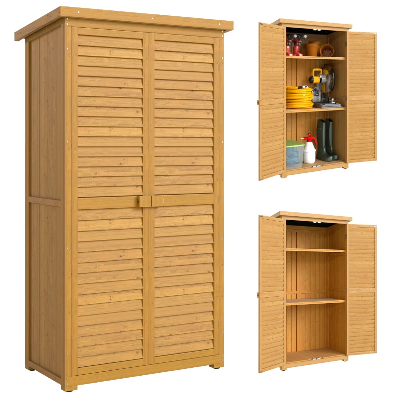 Outsunny Armoire de jardin remise pour outils en bois 2 étagères toit bitumé portes persiennes 87 x 47 x 160 naturel