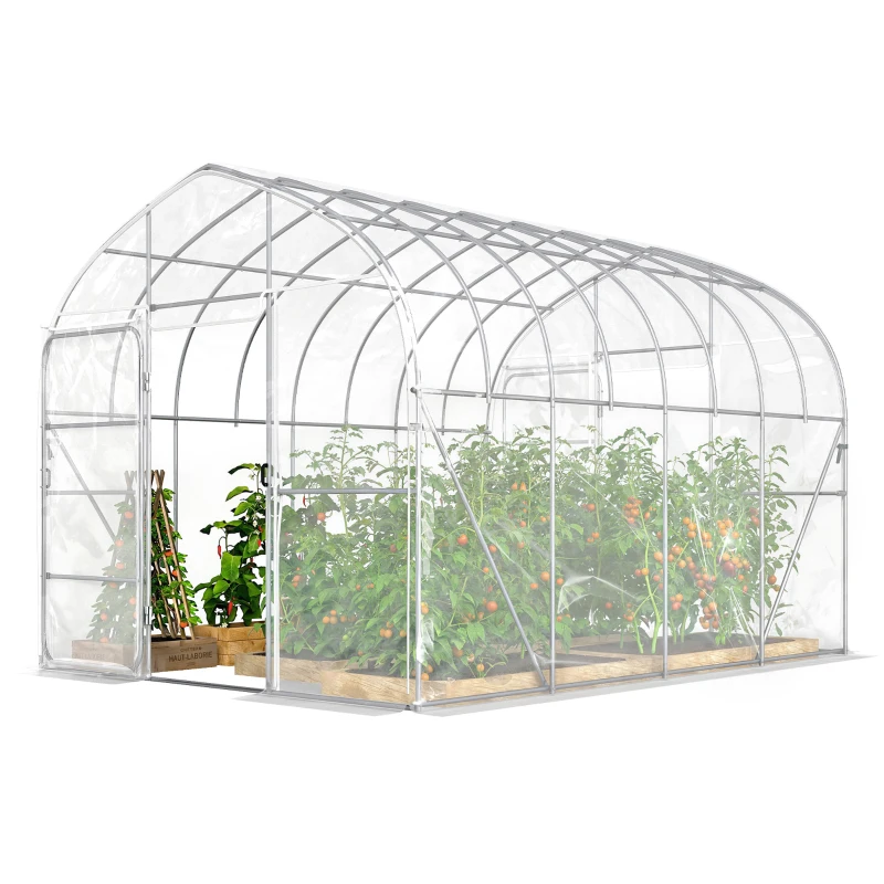 Outsunny Serre Tunnel de Jardin 12m² Film PO Anti-goutte Acier Galvanisé 25mm Structure Renforcée 2 Portes Battantes Transparent(m-8)